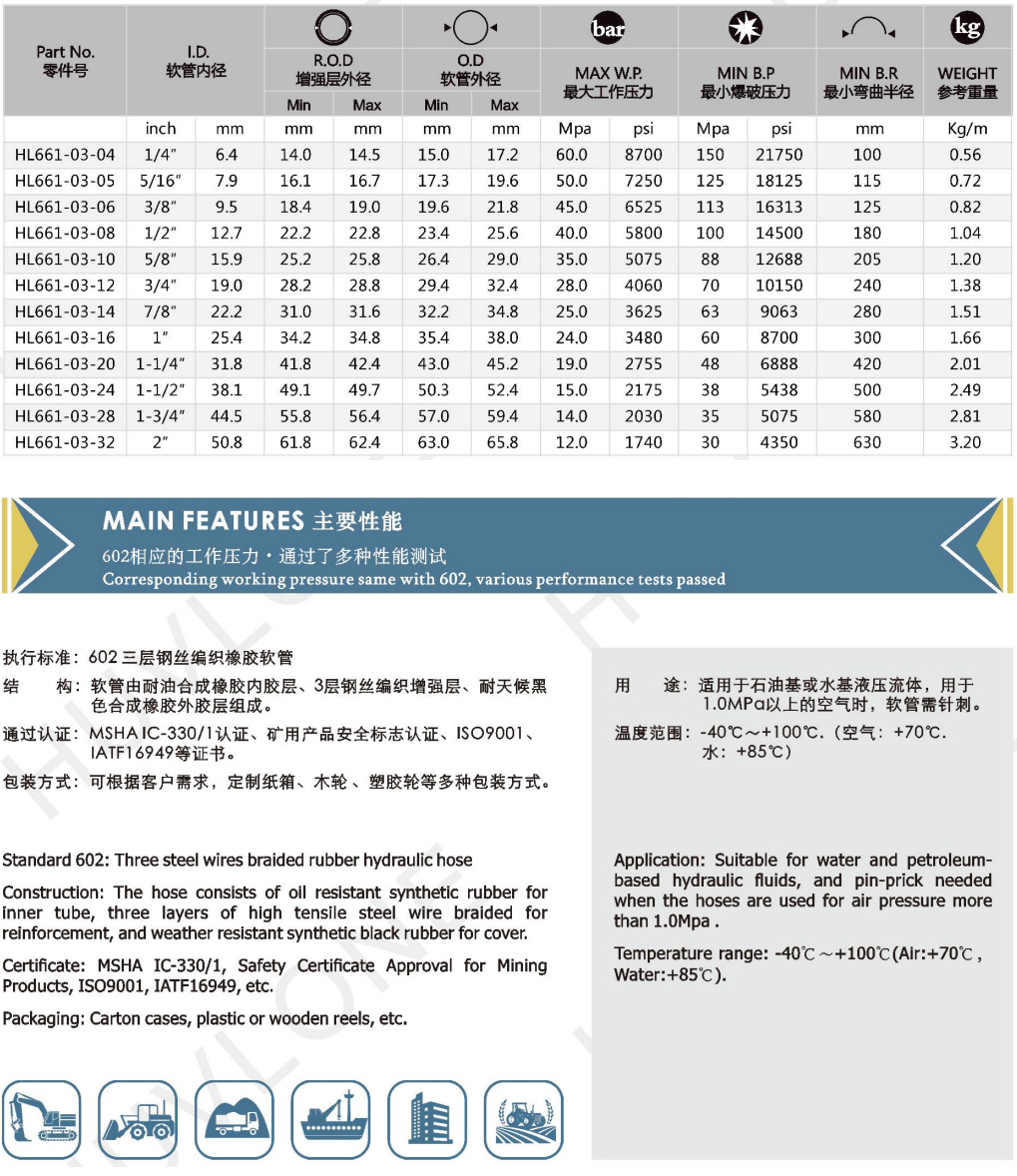 產(chǎn)品用途:適用于石油基或水基液壓流體,用于1.0MPa以上的空氣時(shí),軟管需針刺。