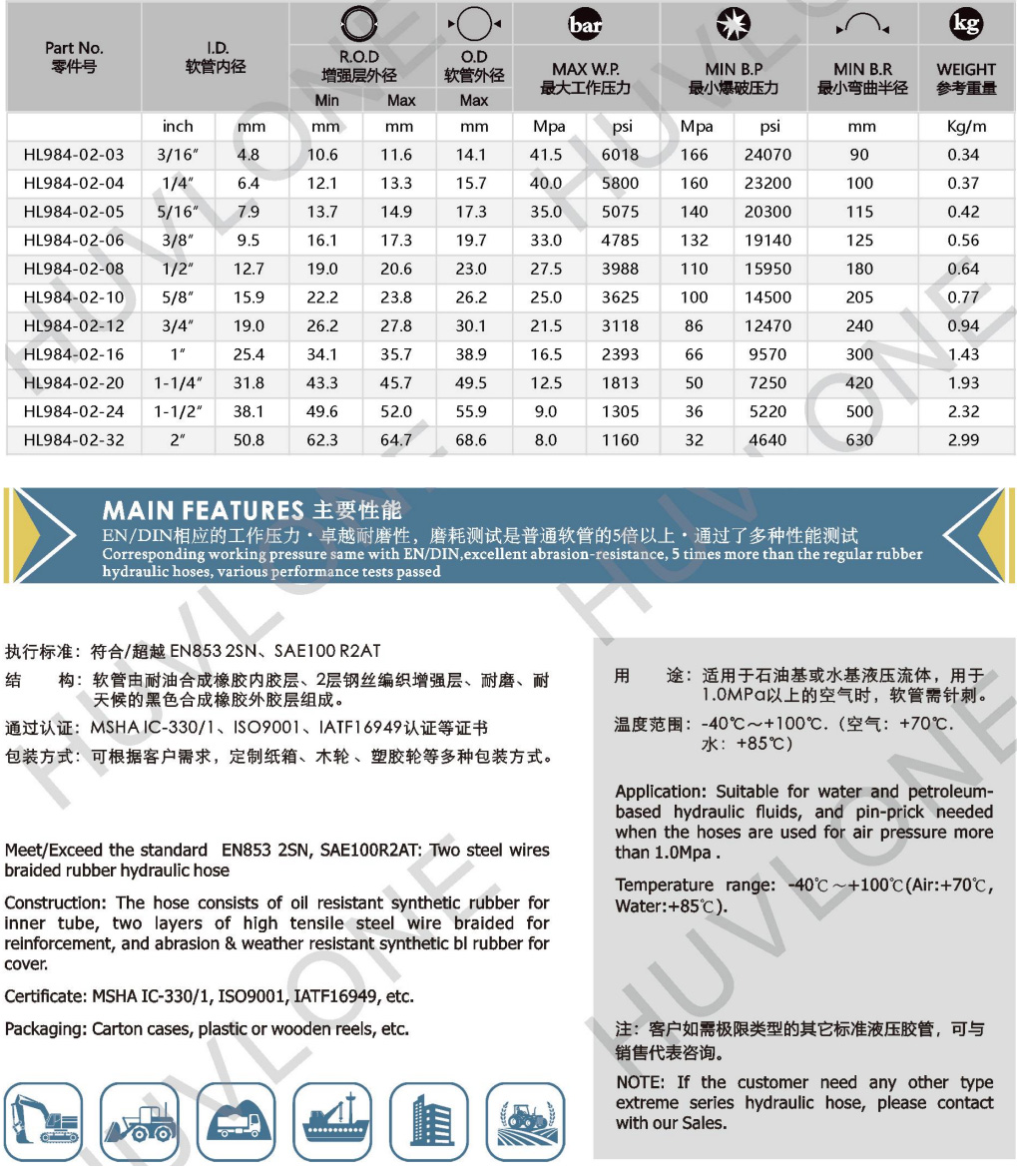 符合/超越EN853 2SN/SAE10OR2AT二層鋼絲編織耐磨橡膠軟管
