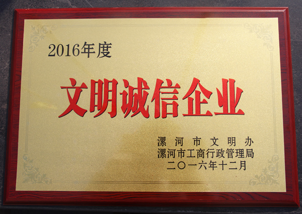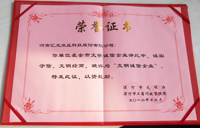 為培育和踐行社會(huì)主義核心價(jià)值觀,不斷提高公民道德素質(zhì)和社會(huì)文明程度,積極營(yíng)造文明、誠(chéng)信的社會(huì)環(huán)境,漯河市文明辦、漯河市工商局在全市開展“文明誠(chéng)信企業(yè)、文明誠(chéng)信商戶”的評(píng)選活動(dòng),通過有關(guān)部門層層嚴(yán)格把關(guān)、逐級(jí)推薦,河南匯龍液壓科技股份有限公司獲得了“2016年度文明誠(chéng)信企業(yè)”的榮譽(yù)稱號(hào)。
