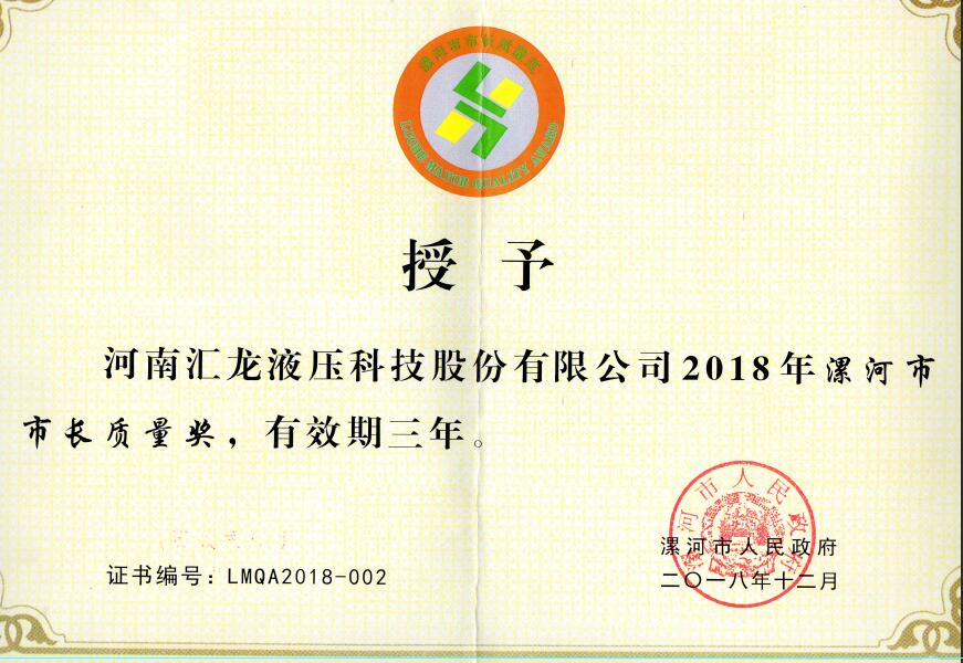 喜獲捷報(bào),匯龍液壓獲得2018年度“市長(zhǎng)質(zhì)量獎(jiǎng)”這個(gè)沉甸甸的榮譽(yù)!