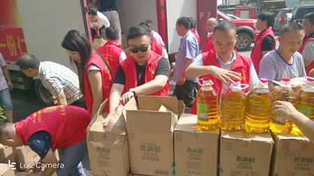 公司副總經(jīng)理、常務(wù)副會(huì)長(zhǎng)周卜榮在酷暑中,頂著35度高溫,汗流浹背卸載賑災(zāi)物資。