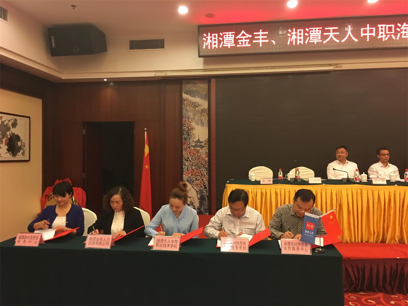 隨后,湖南省對外勞務(wù)合作服務(wù)平臺主任徐曙紅、湘潭市對外勞務(wù)合作服務(wù)中心主任何波、湘潭縣外派勞務(wù)中心主任賀茜、湘潭天人中等職業(yè)技術(shù)學校校長徐慧、湘潭金豐人力資源有限公司董事長卜健萍正式簽署五方《合作協(xié)議》。