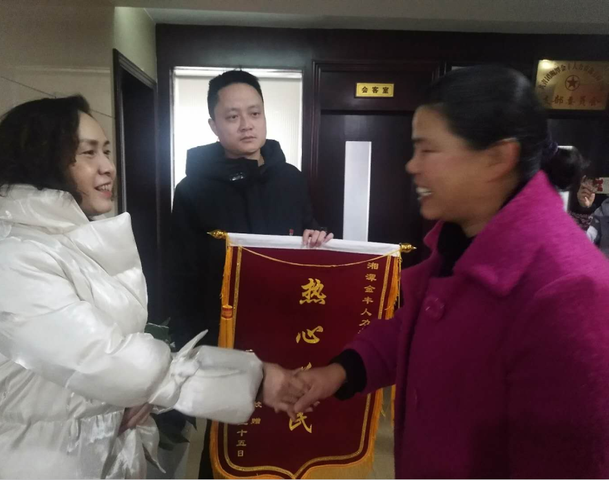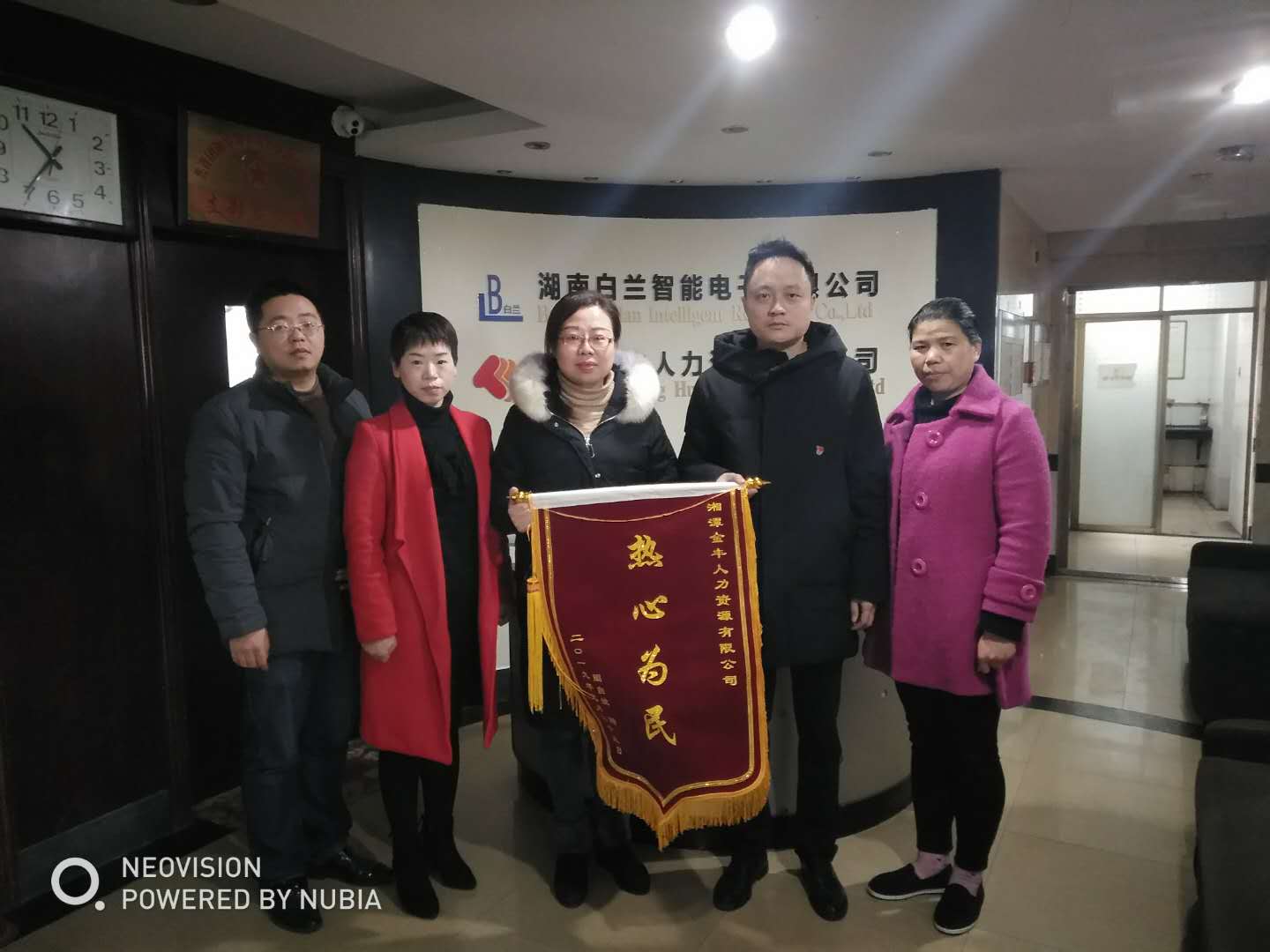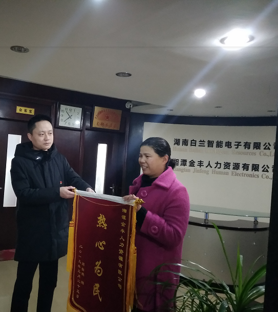 2019年1月25日上午,湘潭金豐人力資源有限公司前臺接待了一位送錦旗的員工。錦旗上醒目地寫著“熱心為民”。