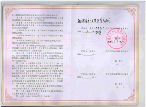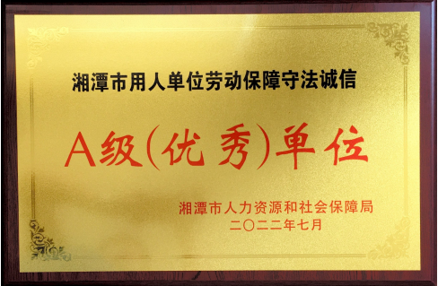 為進(jìn)一步提高用人單位守法誠(chéng)信意識(shí),促進(jìn)用人單位依法用工,構(gòu)建和諧穩(wěn)定勞動(dòng)關(guān)系,切實(shí)維護(hù)勞動(dòng)者合法權(quán)益,根據(jù)《勞動(dòng)保障監(jiān)察條例》(國(guó)務(wù)院令第423號(hào))、《企業(yè)勞動(dòng)保障守法誠(chéng)信等級(jí)評(píng)價(jià)辦法》(人社部規(guī)【2016】1號(hào))和《湖南省用人單位勞動(dòng)保障守法誠(chéng)信等級(jí)評(píng)價(jià)試行辦法》(湘人社發(fā)【2016】92號(hào))相關(guān)規(guī)定,湘潭市人力資源和社會(huì)保障局對(duì)市轄用人單位組織開展了2021年度勞動(dòng)保障守法誠(chéng)信等級(jí)評(píng)價(jià)工作。經(jīng)綜合評(píng)審,我司被評(píng)為2021年度勞動(dòng)保障守法誠(chéng)信A級(jí)優(yōu)秀單位。